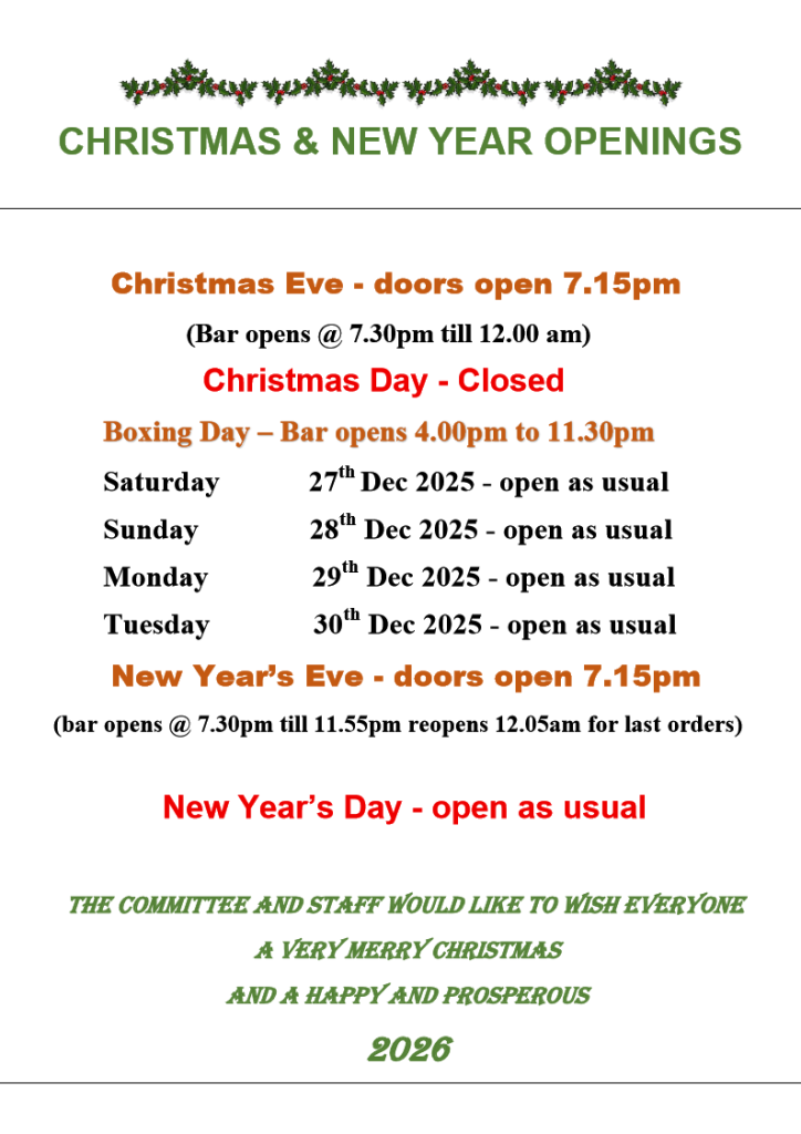 Tickets for Christmas Eve & New Years Eve are now available from the bar during normal opening hours.